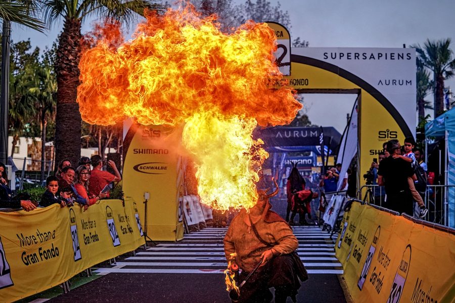 大会前日の登録者のパケットピックアップは至ってスムーズ。当日開始1時間前に、スタート地点に並びに行ったら、すでに1000人はそこにいたのには面喰らいました。VIP登録をした参加者が先にスタートして、短い距離の参加者がスタートして、それから私たち312kmコース参加者。先頭集団に追いつくのに、30分弱かかりました。それまでは、数えきれない数のライダーを右から左から追い越して、まるでTVゲームの画面を眺めているようでした。やっと先頭に追いつき、ひと息入れます。主要道路の端から端まで目いっぱいに広がった数百人はいるであろう巨大なプロトンの中で走る機会なんて普段はまずありえないので、その時間を大いに楽しみました。緊張感が張りつめている様子もなく、最初のクライムまでは皆リラックスしていました。