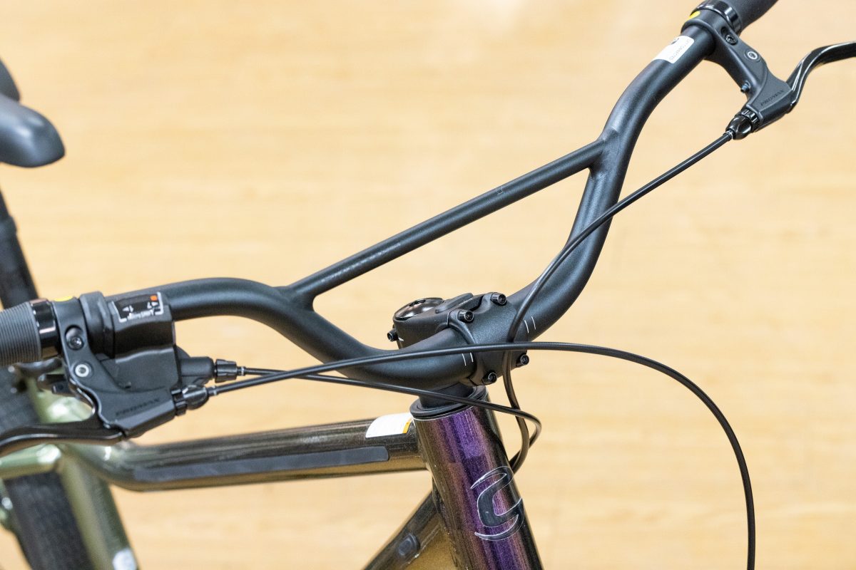 BMXからインスパイアされたハンドルバー。またぎやすいフレーム設計とあいまってアップライトなポジションがとりやすいので、男女問わず使いやすい一台だ