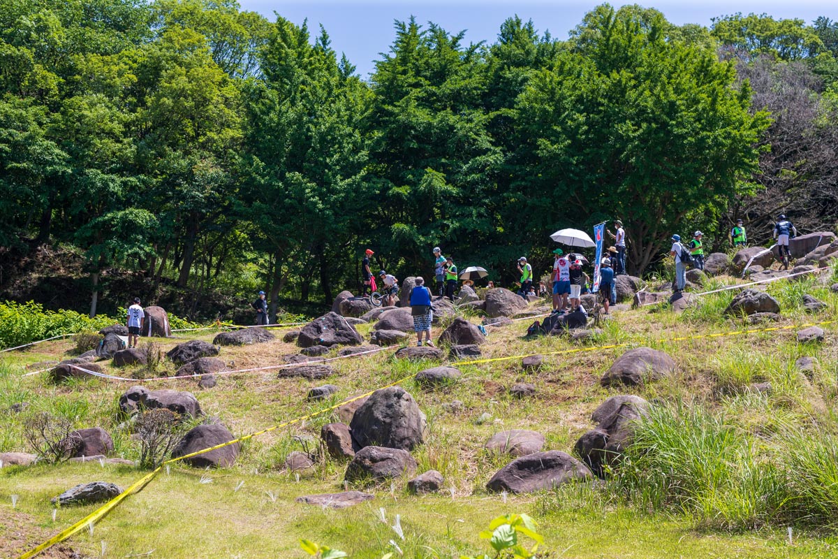 今回使われたのは「浄蓮の滝」「天城越え」のコースを利用、「サクラドロップ」のまわりを含む場所だ。東京2020、クロスカントリーレースでマチュー・ファンデルプールに悪夢を植え付けた場所といえばどこか思い出す方も多いだろう。あれからほぼ1年、衝撃を受けた場所はトライアル選手たちが軽快に駆け上がっていくロックセクションと化していた。クロスカントリーとトライアル。以前では考えられないコースの共通化だろう。