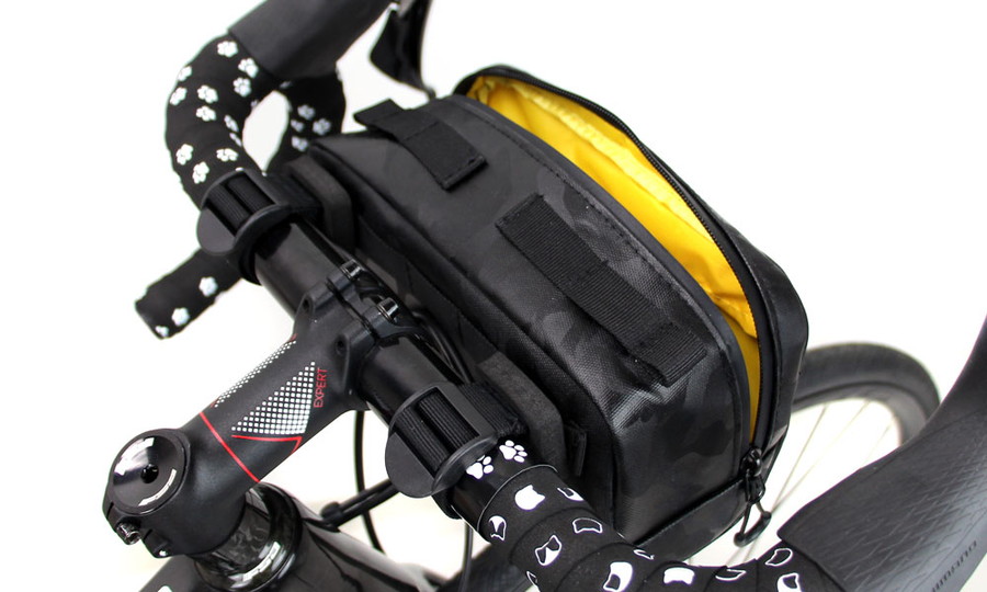 しっかりとした芯材を採用しているので、垂れ下がりにくい。ワイヤーがフル内装のハンドルにも美しく取り付けられるように、ベルトの取り付け位置は背面と天面の2カ所から選ぶことができます。クッションスペーサー(厚さ10mmx2個)が付属しているので、ハンドルバーにしっかりと固定できます。内側は中身が見えやすいように、黄色の裏地。撥水素材と止水ファスナーを採用しているので、少々の雨なら大丈夫ですが、縫い目からは浸水します。