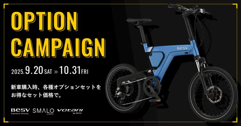 2025年9月20日(土)から10月31日(金)までの期間限定で、BESVの新車と同時購入なら対象のオプションセットが特別価格に。クロスバイクタイプのJF1を普段使い仕様にできるセットは、驚きの52%OFF。Votaniシリーズも対象となり、日常ユースに必要なアイテムをまとめてお得に揃える絶好の機会だ。BESVを検討中なら、このキャンペーンを今すぐチェック!