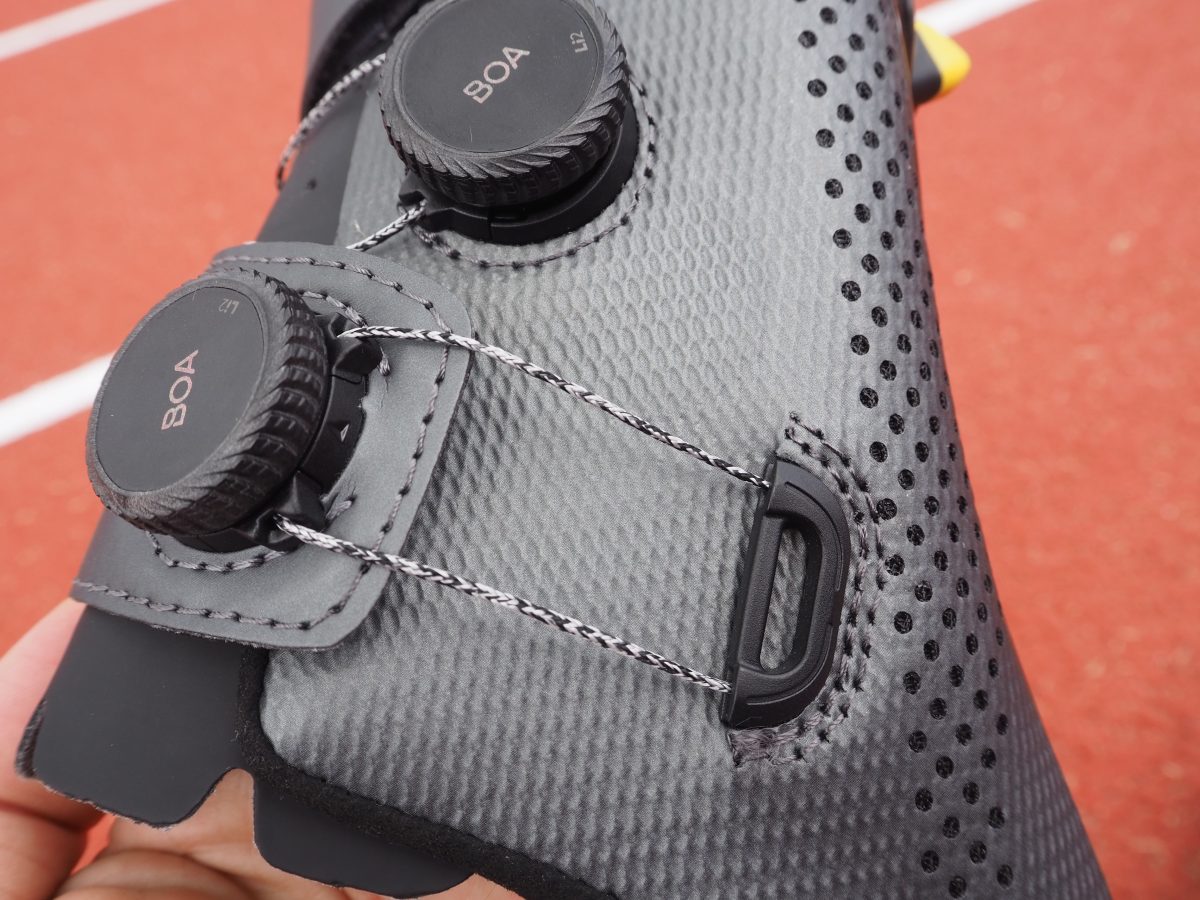 自転車がなかったので、履くだけしかできなかったが、まずBOAダイヤル自体はいうまでもなく細かくスムーズに調整可能。全体のしなやかな生地と「ExoWrap」システムによる足の甲の包むこみが気持ちいい。またこれまでのモデルよりも横幅ワイドな気がした。少し触っただけでは断定できないか、ダイニーマの紐もなかなか巻き取りの感触がいい。これで耐久力が増しているとすれば、さらに好印象だ。色が付いていてオシャレさもアップ!