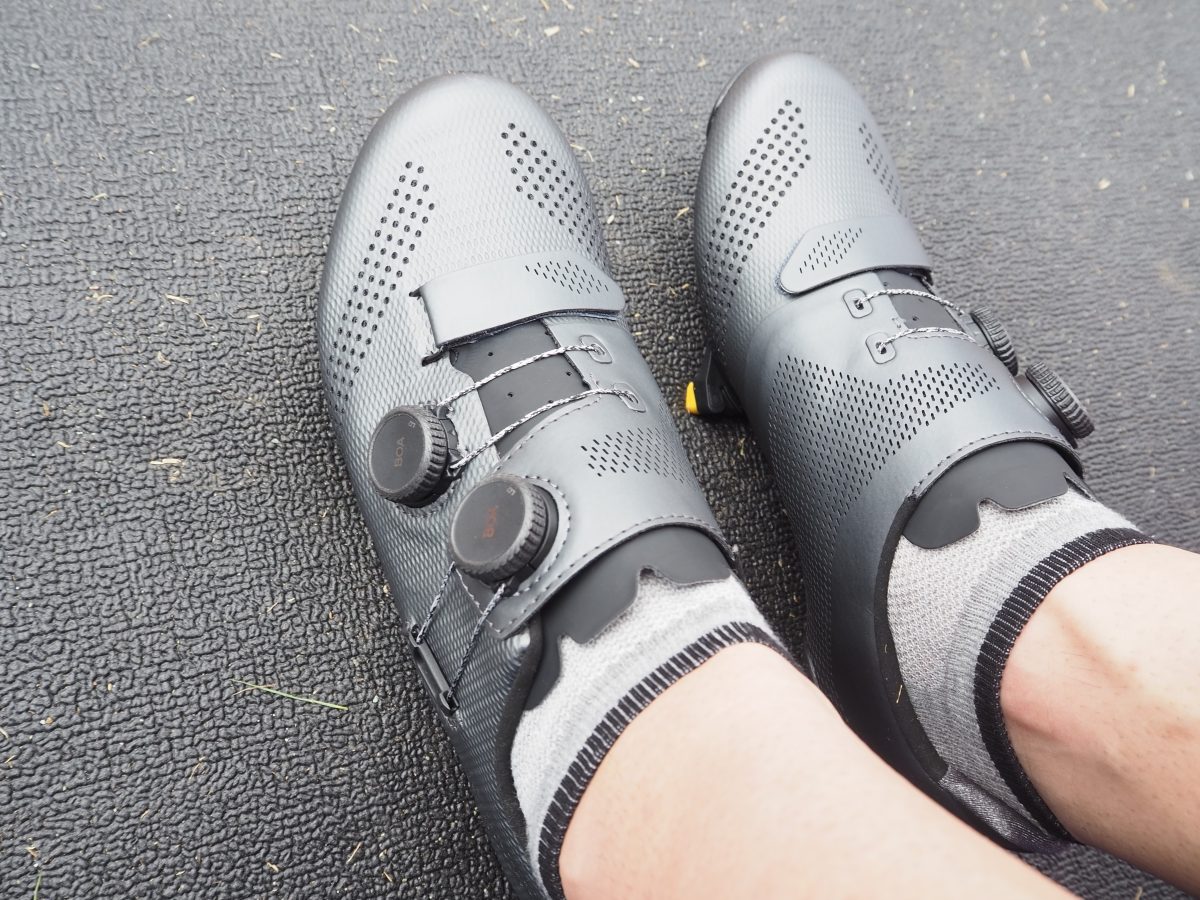 自転車がなかったので、履くだけしかできなかったが、まずBOAダイヤル自体はいうまでもなく細かくスムーズに調整可能。全体のしなやかな生地と「ExoWrap」システムによる足の甲の包むこみが気持ちいい。またこれまでのモデルよりも横幅ワイドな気がした。少し触っただけでは断定できないか、ダイニーマの紐もなかなか巻き取りの感触がいい。これで耐久力が増しているとすれば、さらに好印象だ。色が付いていてオシャレさもアップ!