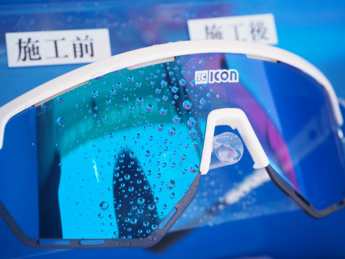 施工も非常にラクチン。レンズ表面にスプレーし、約5~10分乾燥させるだけで施工が完了。拭き取りなどの必要もなし。今まで施工が難しかった “強撥水レンズ”にもムラなく定着させ仕上げることが可能に。試しに水を吹きかけてみると下のとおり。左と右で大違い。施工するとしないとで、その差は歴然。雨のレースが想定される前日や当日朝に施工すれば、レース中に視界を塞がれることがほぼなくなるだろう。