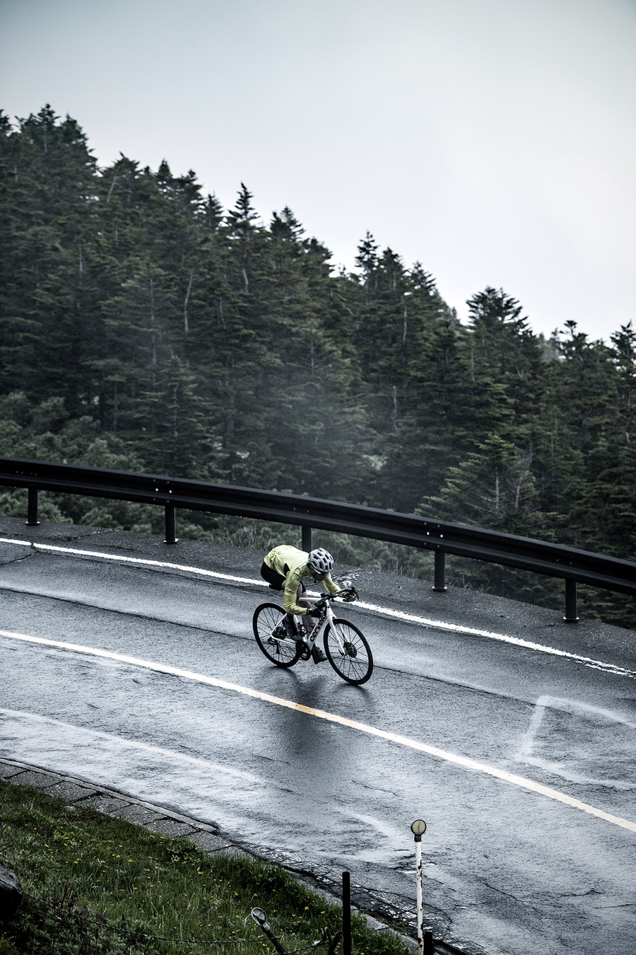 テスト環境がウェットコンディションだったこともあり、最初は様子を見ながら下りコーナーを何度か走ったが、少しずつスピードを上げても不安な要素はなかった。乗る前にタイヤ表面を手でなでたときにしっとりと吸い付く感じはいかにもグリップ力が高そうであったが、その印象は裏切られない。むしろこのグリップ感であれだけ直進時の低抵抗を実現していることは見事だ。