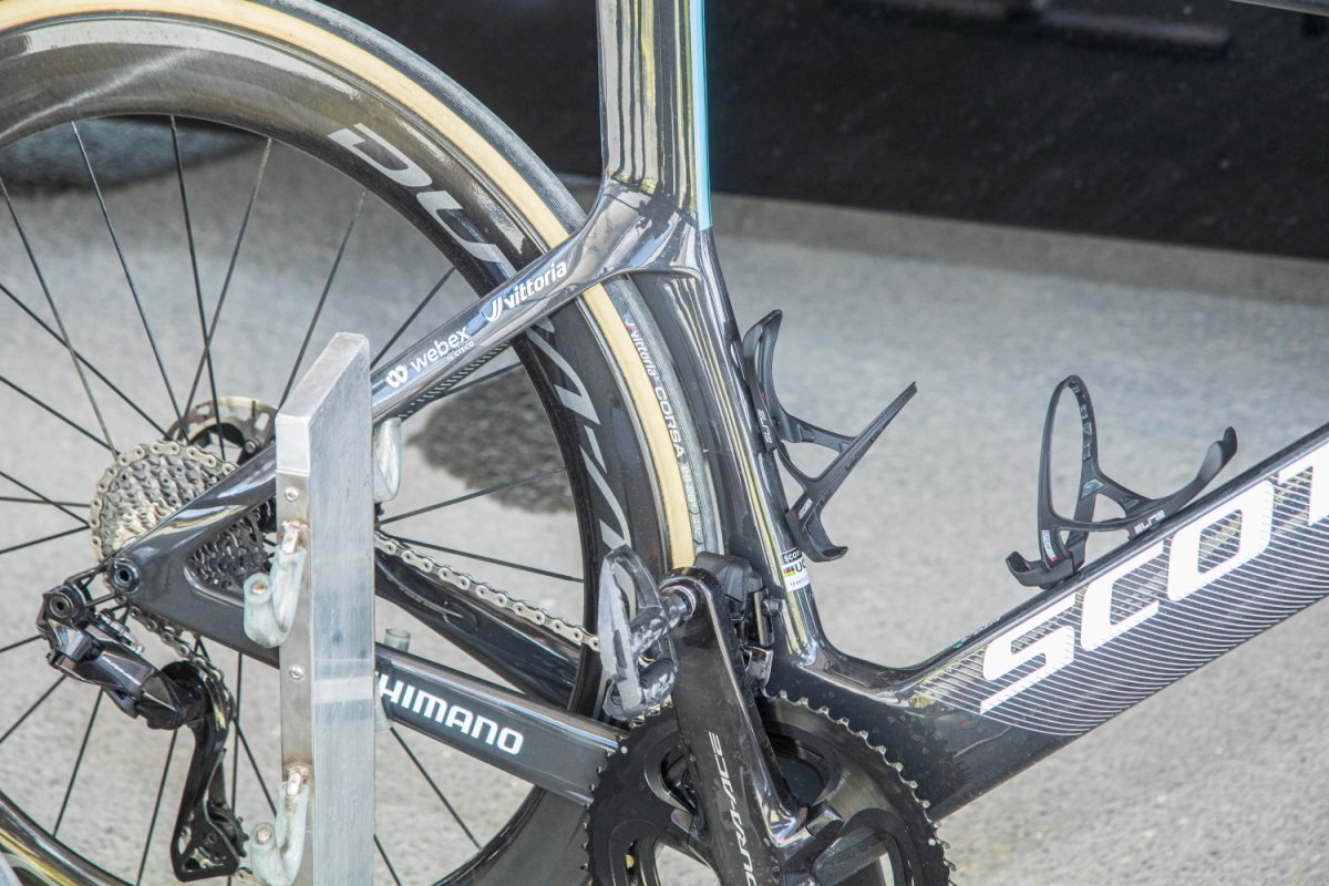 このモデルにおいては、フォーク内での最適なエアロ性能を発揮するため25cのタイヤ装着が推奨されているが、最大で30cまでは対応。実際に、パヴェを走行した第5ステージでは全選手が30cでコースへと繰り出している。