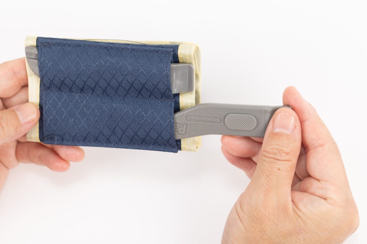 札入れのほか、パカッとひらく小銭入れも。カード入れの上にはタイヤパッチが入るポケット付き。そして背面にはタイヤレバー2本がピッタリ収まるスリット!