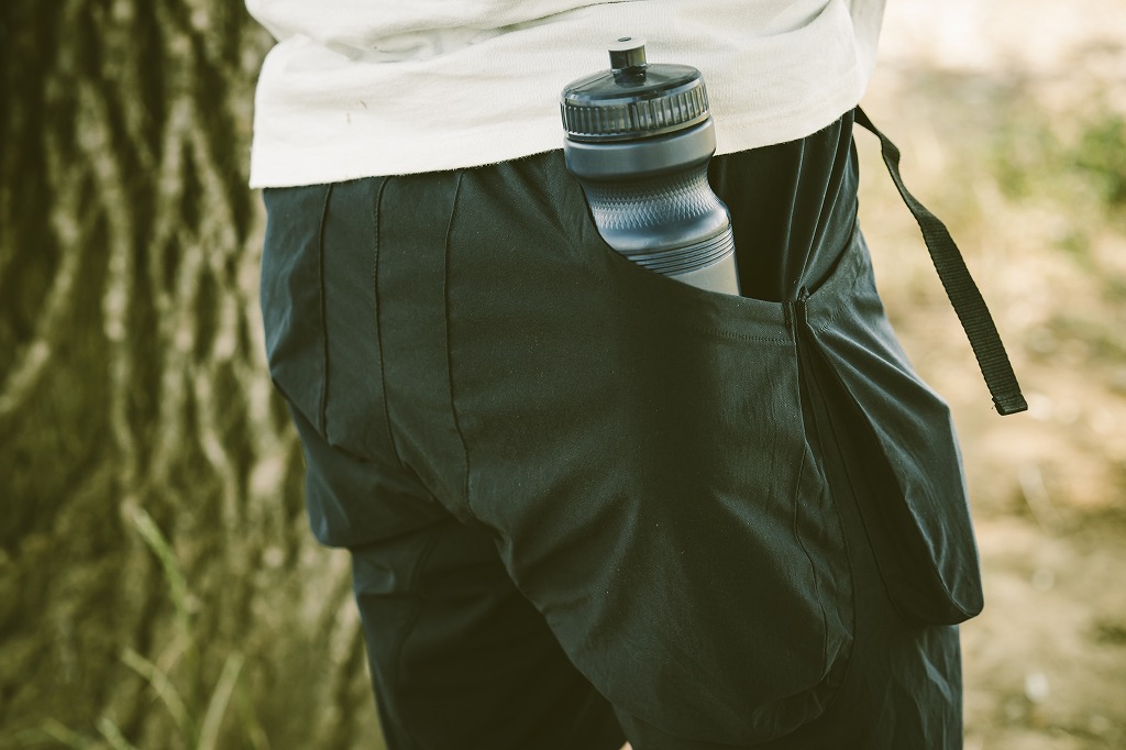ボトルも余裕で入るたっぷりサイズのカーゴポケット(製品版は後部にボタンを追加)。モノを入れやすい斜めの開口部と振動で飛び出しづらい深さを持っている