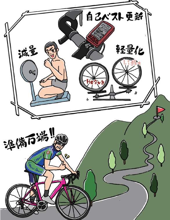 まずは1年前より自分のタイムを短縮する方法。去年の自分に勝つということは、じつはレース前から始まっている。たとえば去年と同じ時期の開催レースにおいて、「今年は体重が軽い」「マイ峠で去年よりもタイムを更新している」「自転車の重量が軽い」などもあるかな。