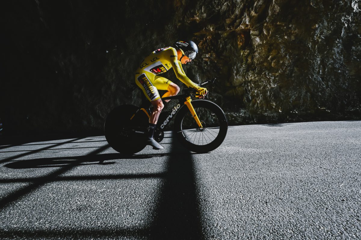 そして最終走者ヴィンゲゴー。イエローに身を包んでスタートを切ると、個人総合トップを守るどころかステージ優勝にも届きそうな勢いで序盤から全開。第1計測からトップに立つと、第2計測、第3計測ともチームメートのファンアールトの記録を更新する。迎えた終盤、下り区間でコーナーをオーバーランしかけてあわやコースアウトのピンチこそあったものの、うまく体勢を立て直して最終局面へ。ステージ優勝の可能性もあったが、残り500mでマイヨジョーヌのキープを確信してスピードダウン。最後は勝利の喜びをかみしめるようにしてフィニッシュラインへと到達した。