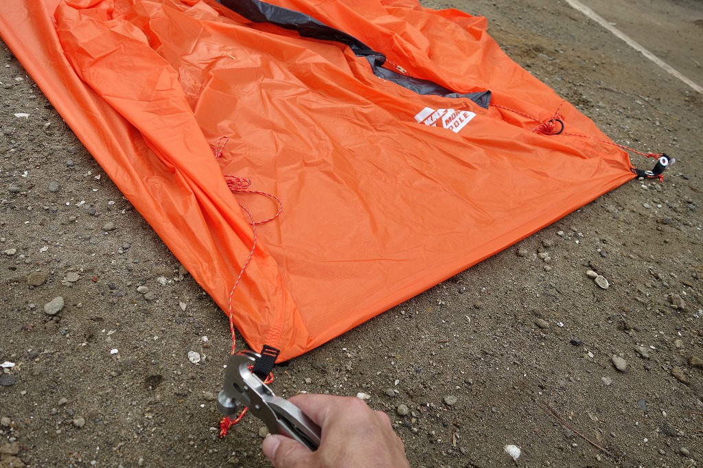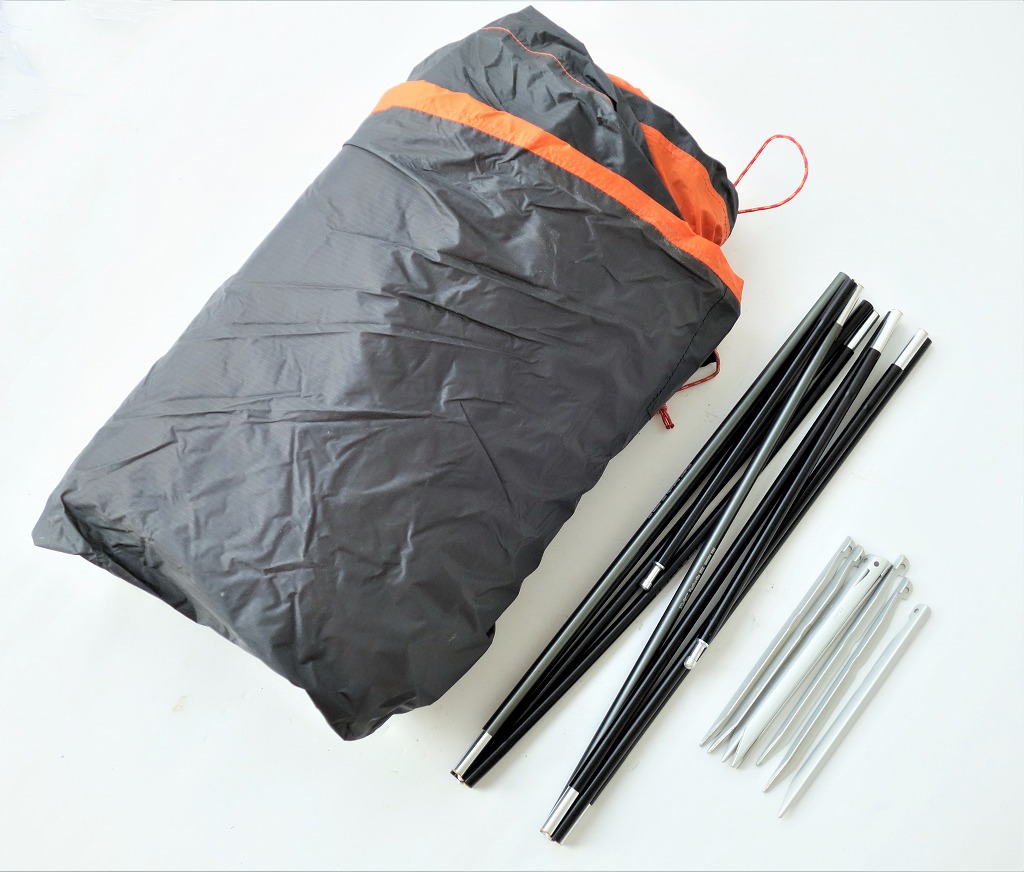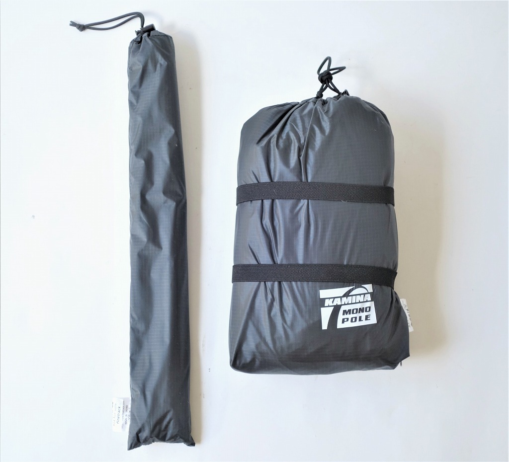 モノポールというだけに、ポールは1本の非自立式。ポールは折りたたんだ状態で39㎝しかないので自転車で運ぶのにも便利。シンプルな構造で軽量ながら、テント生地自体はわりとしっかりしている。