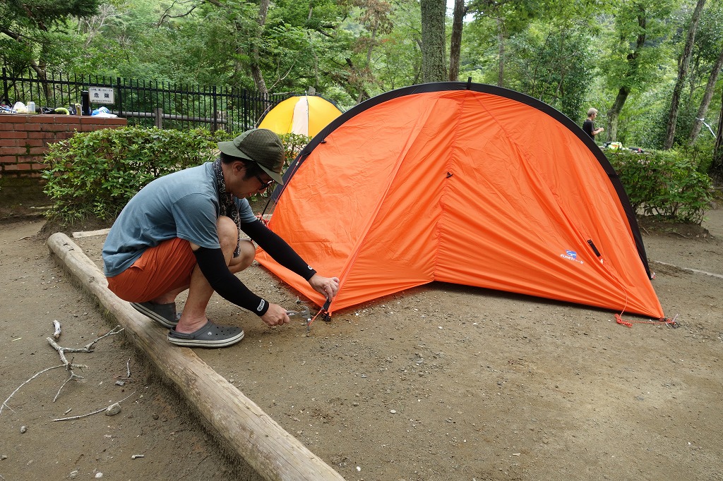 カミナモノポールは非自立式のテントだが、設営はびっくりするほど簡単。まずは底辺の四隅をペグダウン。1本のポールを通す。