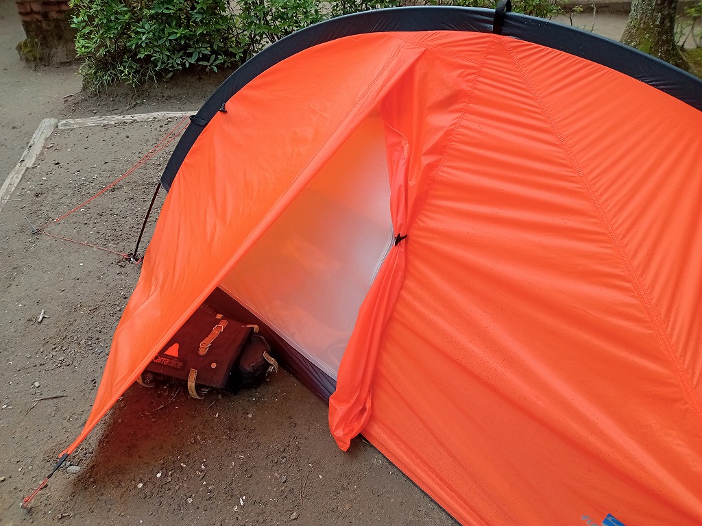 超軽量テントながら居住面積も広く、なによりテント自体がしっかりしているので安心感があった。夜中に予想しない大雨に降られたがぜんぜん大丈夫。これはオールシーズン使えるというだけのことはある。軽くコンパクトで、かつ山岳で使えるレベルの機能を備えている。結論としては、カミナモノポールをサイクルキャンプで使うのは大いにありと思った。自転車で使いたい人は、ツーリングバッグがついてくる今が買いかも!