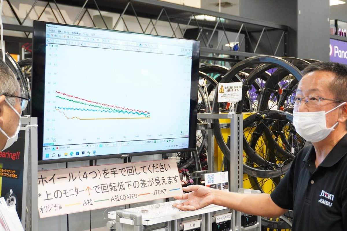 自動車のターボエンジン内部に使用されるベアリングは300℃以上の高温環境下で1分間に20万回転もの高速で使用される。一方で自転車用のベアリングは常温で使用され回転数は1分間に300〜600回転前後。使用環境が異なればベアリングに求められる性能も異なる。そこで同社のアフターマーケット事業本部では自転車の使用環境にマッチしたベアリングにすべく設計を行なった。