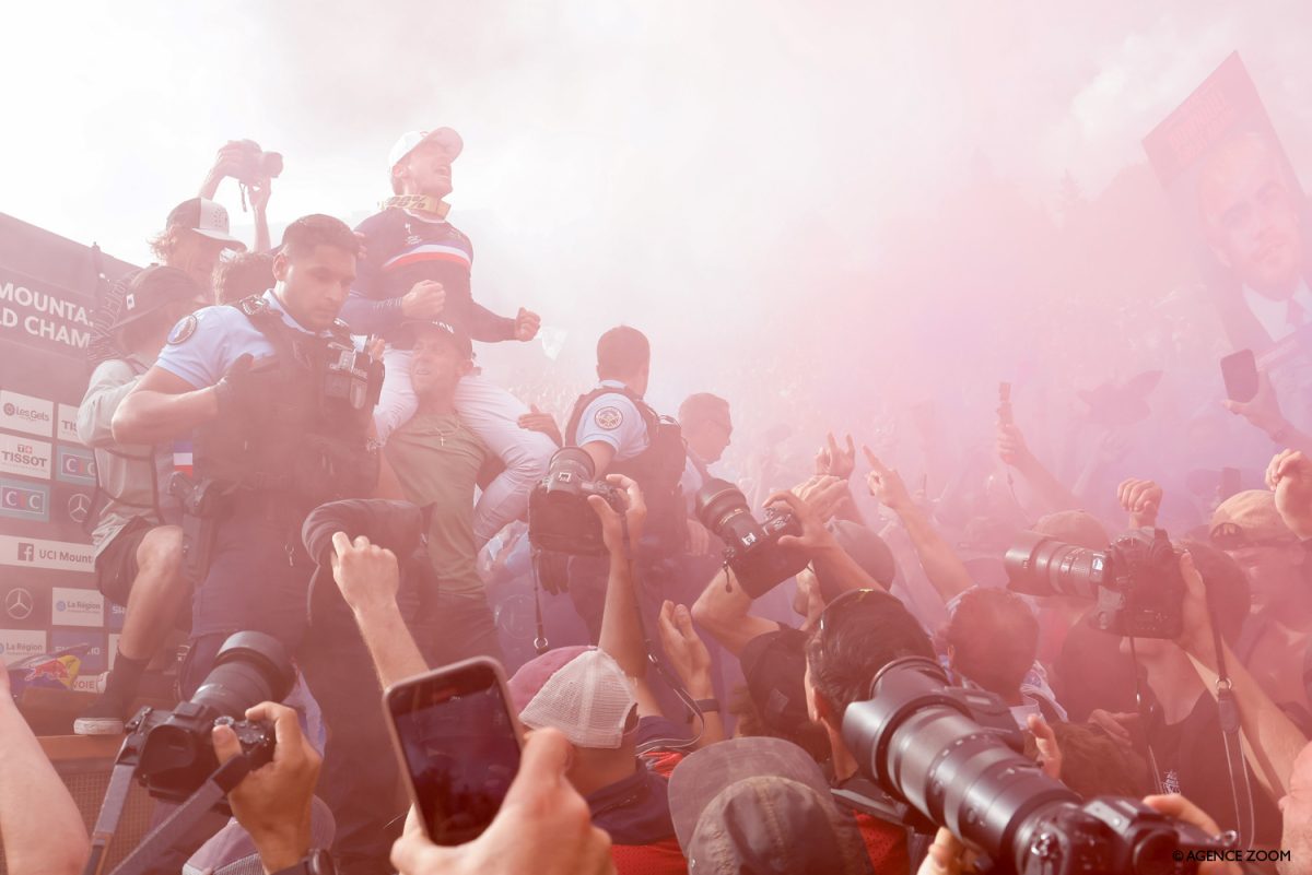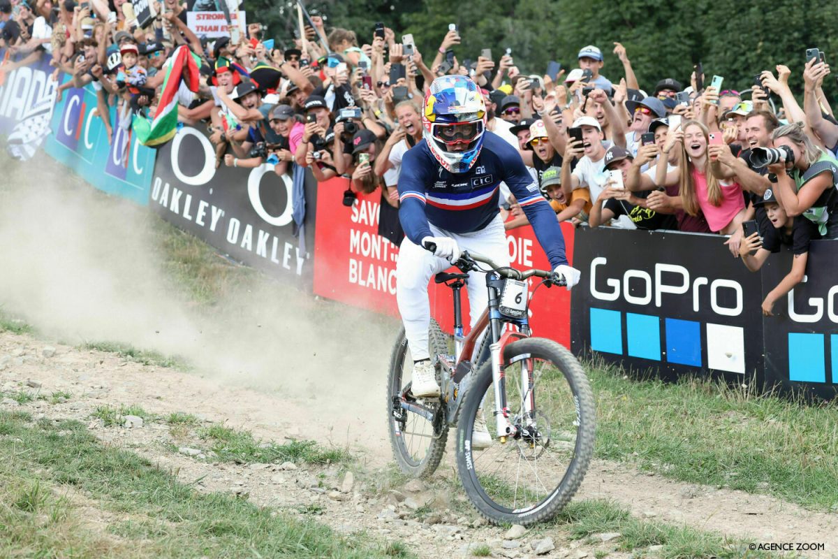 4万人という凄まじい観客が集まったフランス・レジェで開催された世界選手権DHI。今回、地元のフランス勢はロイック・ブルーニが優勝、2位にアモリ・ピエロン、3位にロリス・ヴェルジェが続き、トップを独占するなど、会場は熱狂に包まれていた。DHIは日本ではマイナー競技だが、ヨーロッパの自転車では激しさスピードを含めて花形競技の一つ。そのスピードは上位選手では55km/hを超えていた。