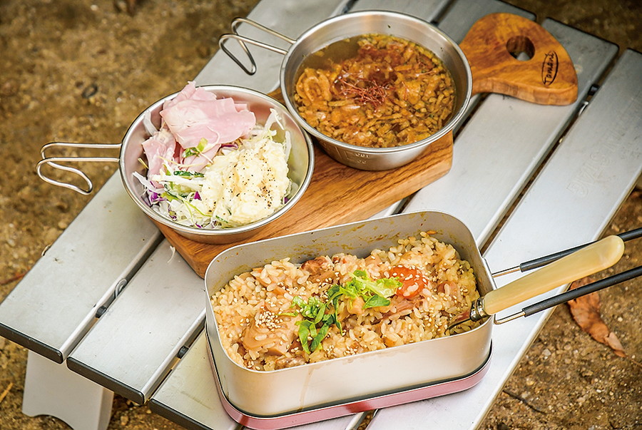 スキレットでパエリアを作ることもあるけど、今回はメスティンでお手軽メシ。アルファ米に入れて煮るだけの炊き込みごはんと、コンビニサラダ&即席スープ。
