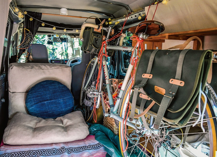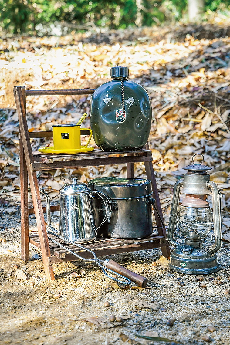 オイルランタンや古い水筒などお気に入りアイテムを持ってこられるのはクルマならでは。自転車もそのひとつ、好きなものに囲まれてアウトドアを楽しみたい。