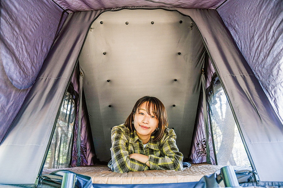 最近導入のニューアイテムは、クルマの上に装着したルーフテント。ベルトを外せばワンタッチでテントが広がる、撤収も通常のテントよりカンタン。