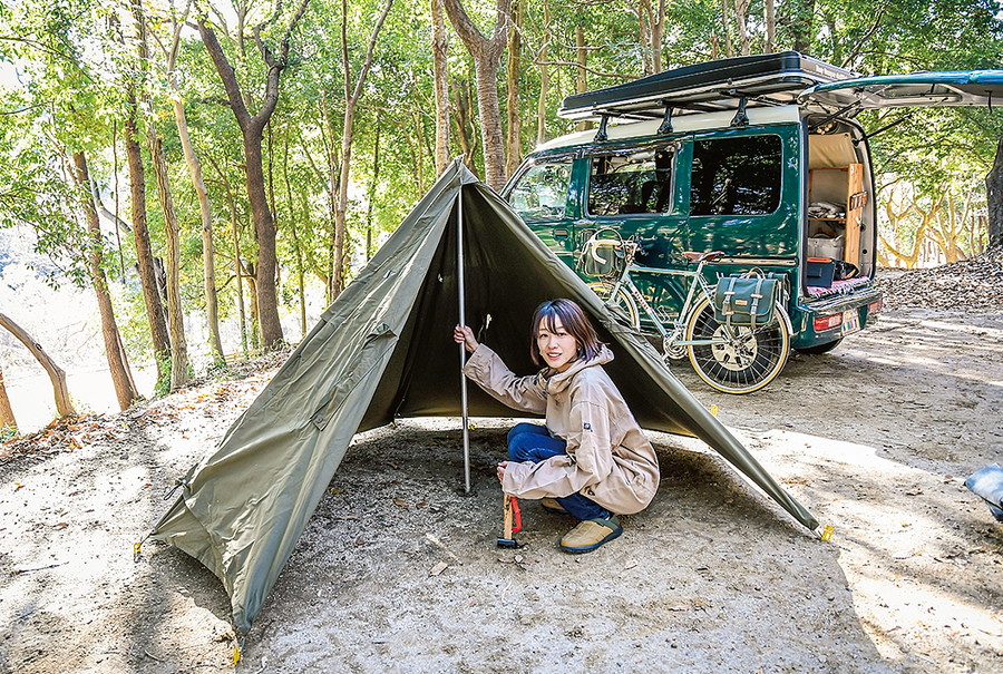 ちょもか流ゆるポタキャンプスタイル、軍幕にランドナーと渋めが好み|車中泊女子の自転車×キャンプ