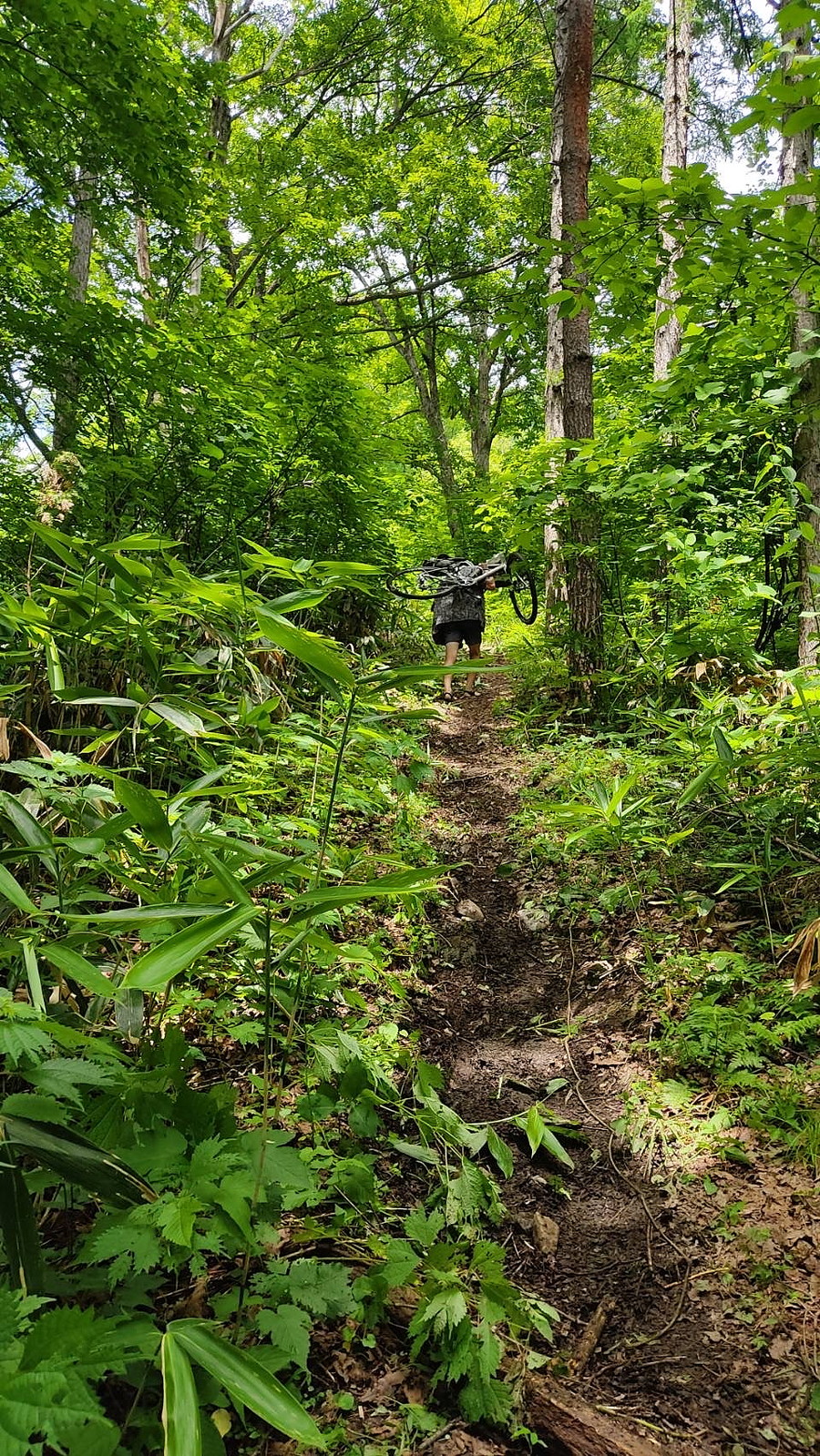 高得点CPはかなり見つけづらいと他チームからの情報が入っており、初日に取っていないこともあるので、時間を多めに割きたかったところですが、CPがある山の麓に着いたころには、結構ギリギリの時間。迷っている暇はないと言って、地図読み役の寺尾がすごい勢いでバイクを担いでトレイルを先導していきます。