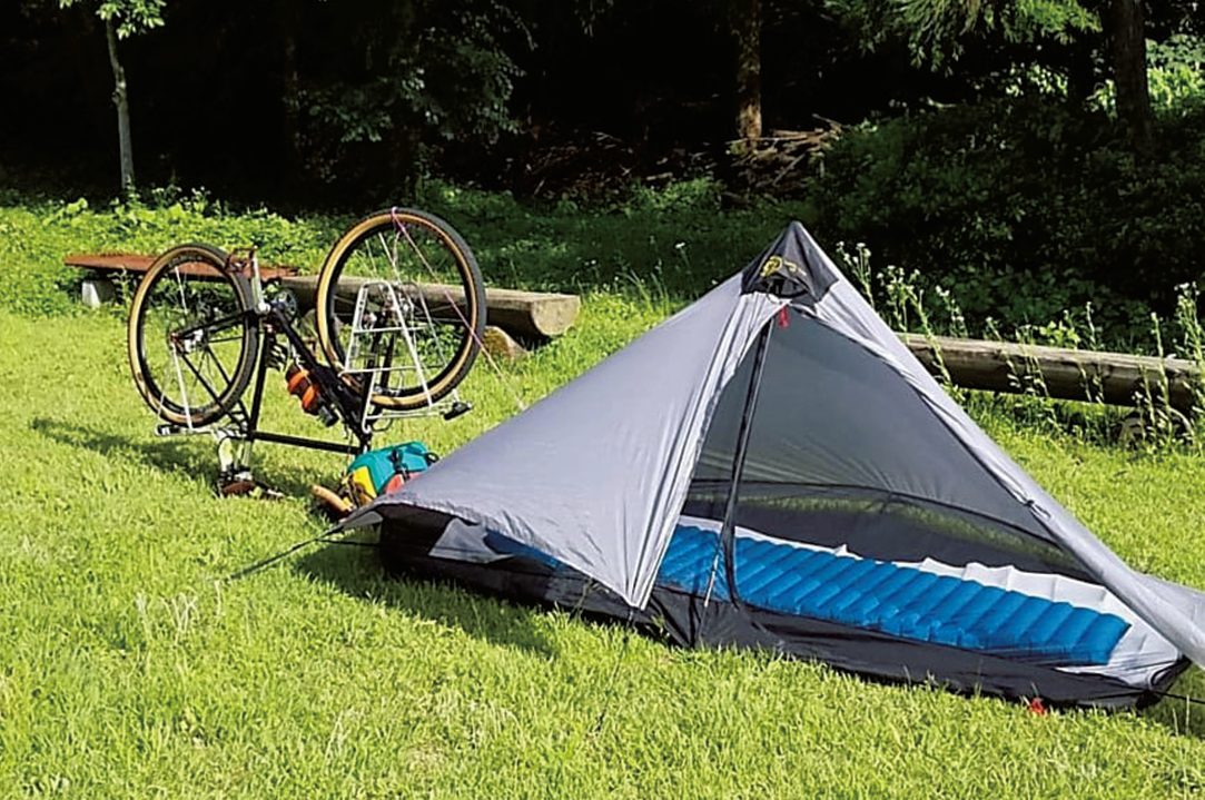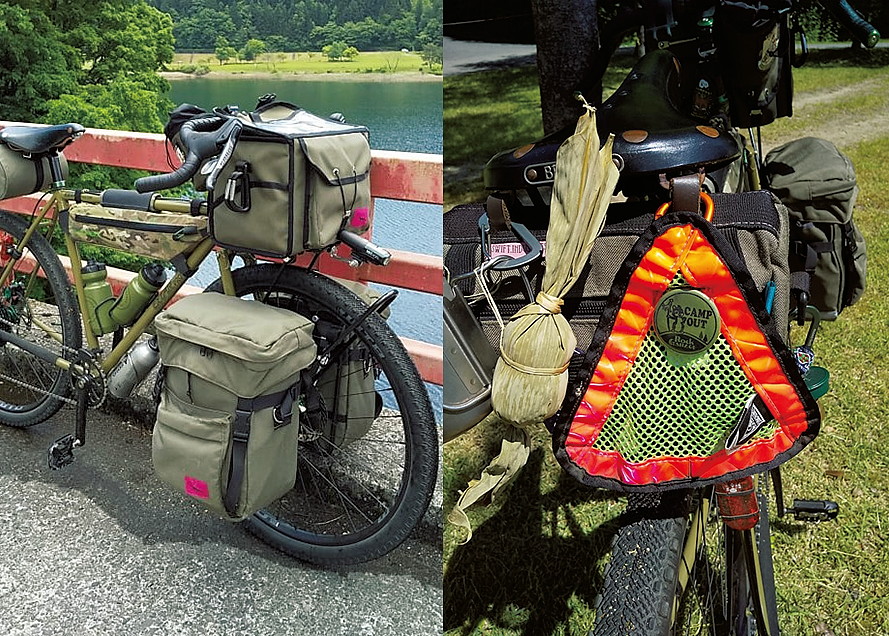近年流行りのグラベルなエッセンスも効いたハイセンスな一台。通な自転車キャンパーのお手本としたいものだ。