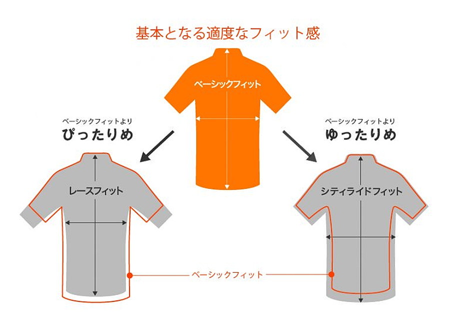 パールイズミでは温度に合わせてウェアを選ぶことができるだけではなく、ユーザーの好みやライドスタイルに合わせた3つのフィット感が用意されている。ご近所ライドからロングライド、イベント参加まで幅広くカバーできるはじめての1着にもおすすめのベーシックフィットを基準に、レースやトレーニングに最適なバタつきの少ないぴったりめのレースフィット、街乗りやポタリングなど普段着感覚で着用できるゆったりめのシティライドフィットがラインアップ!