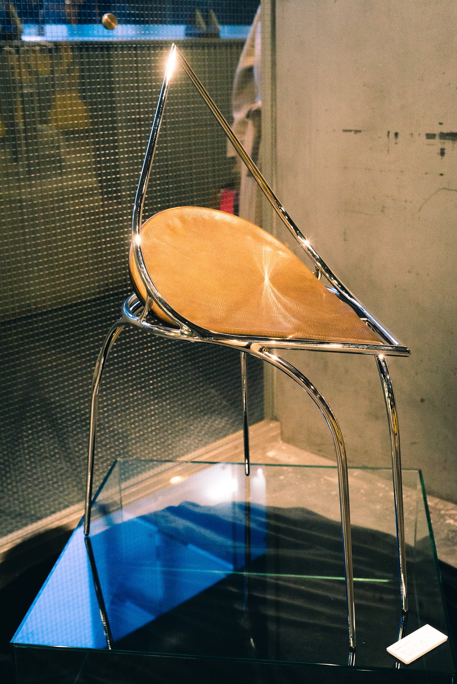 椅子は自転車のパイプ(主にシートステー)を使い、座面の革細工はバッグコースの講師陣に制作協力していただいた。