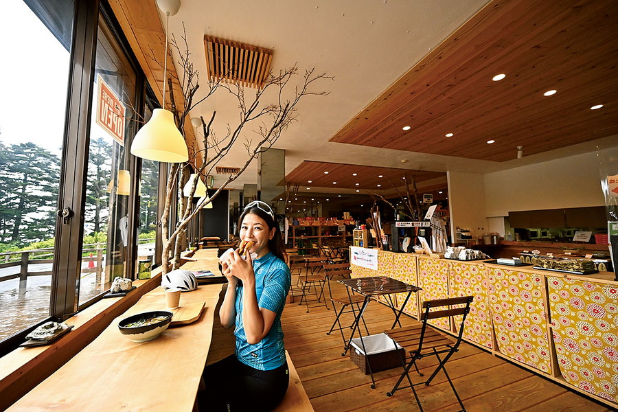 カフェやモンベルコーナーが併設され、屋外にはテラス席もあるなどサイクリストも利用しやすい施設。改装前から愛されていた「アマゴうどん」のほか、ジビエを使用したおにぎりやホットドッグも人気が高い。