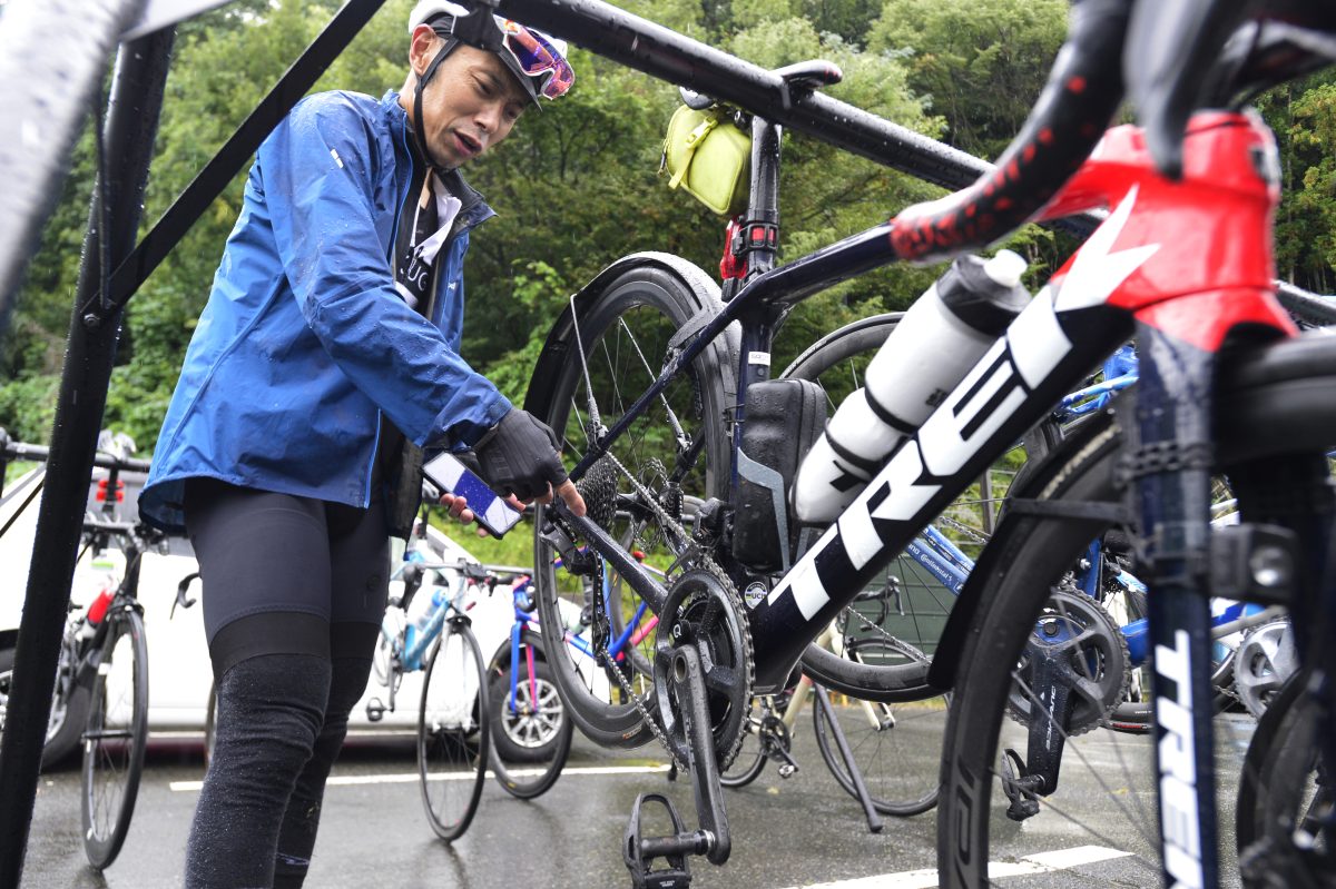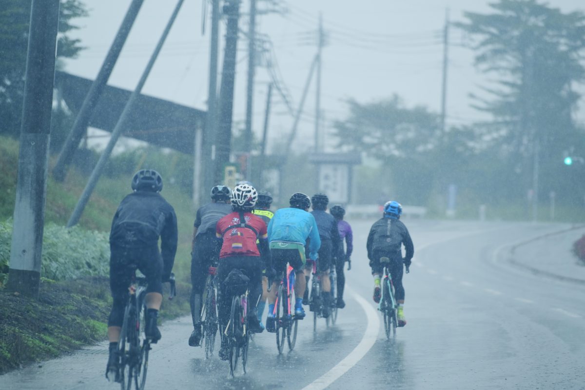 泥除けを付けるメリットとしては、自分のお尻や背中が濡れないのと、後方を走るライダーへ水しぶきが飛ばないという配慮となる。そしてもう一つ、イナーメのシャモアジェル(股ずれクリーム)を肛門に塗った。そのメリットは肛門が体の中で一番繊細でそこを濡らしてしまう事で体温が失われていってしまうからだ。普段も雨の中で走るなかで得た経験の技だと勝手に思っている。