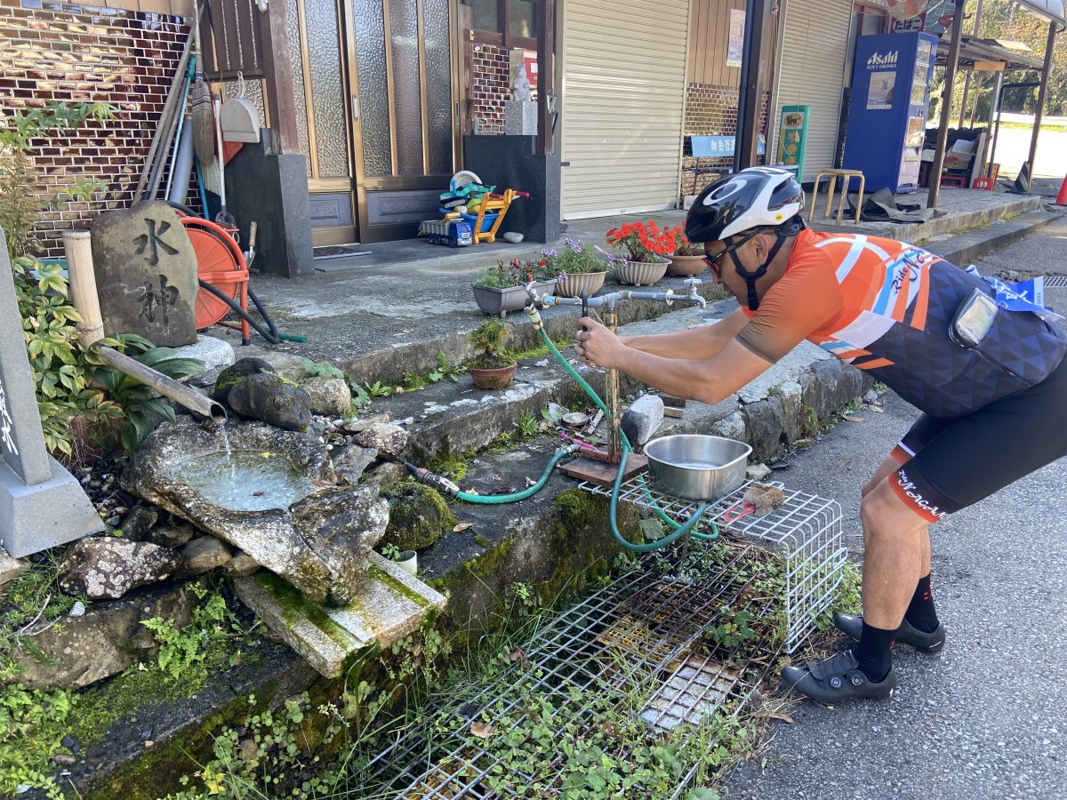 御嶽山からはフィニッシュ地点までは約40kmはほぼ下り、気持ちいいダウンヒルが続く。途中、グランピング場のある木曽温泉黄金の湯で最後のエイド。ここからは鈴木雷太さんと合流して下っていくと、さらにとっておきのポイントを教えてもらった。なんと天然炭酸水が湧き出す泉があるのだ。飲んでみると確かに炭酸水。