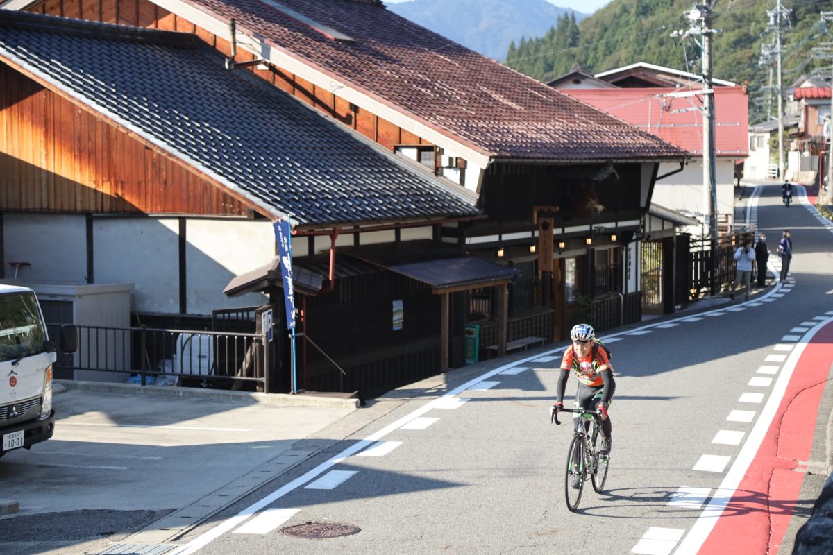 参加者は朝7時、薄曇りのなか御岳湖近くにある日野百草本舗 王滝店から走り始める。はじめは肌寒かったが、しばらくすると日が差し始め、朝日の気持ちがいい風景のなか木曽福島へ向けて下ると旧中山道の町並みを進む。そして20分ほどいくと「中乗りさん」で知られる趣のある建物の中善酒造があり、植物性乳酸あま酒がふるまわれた。