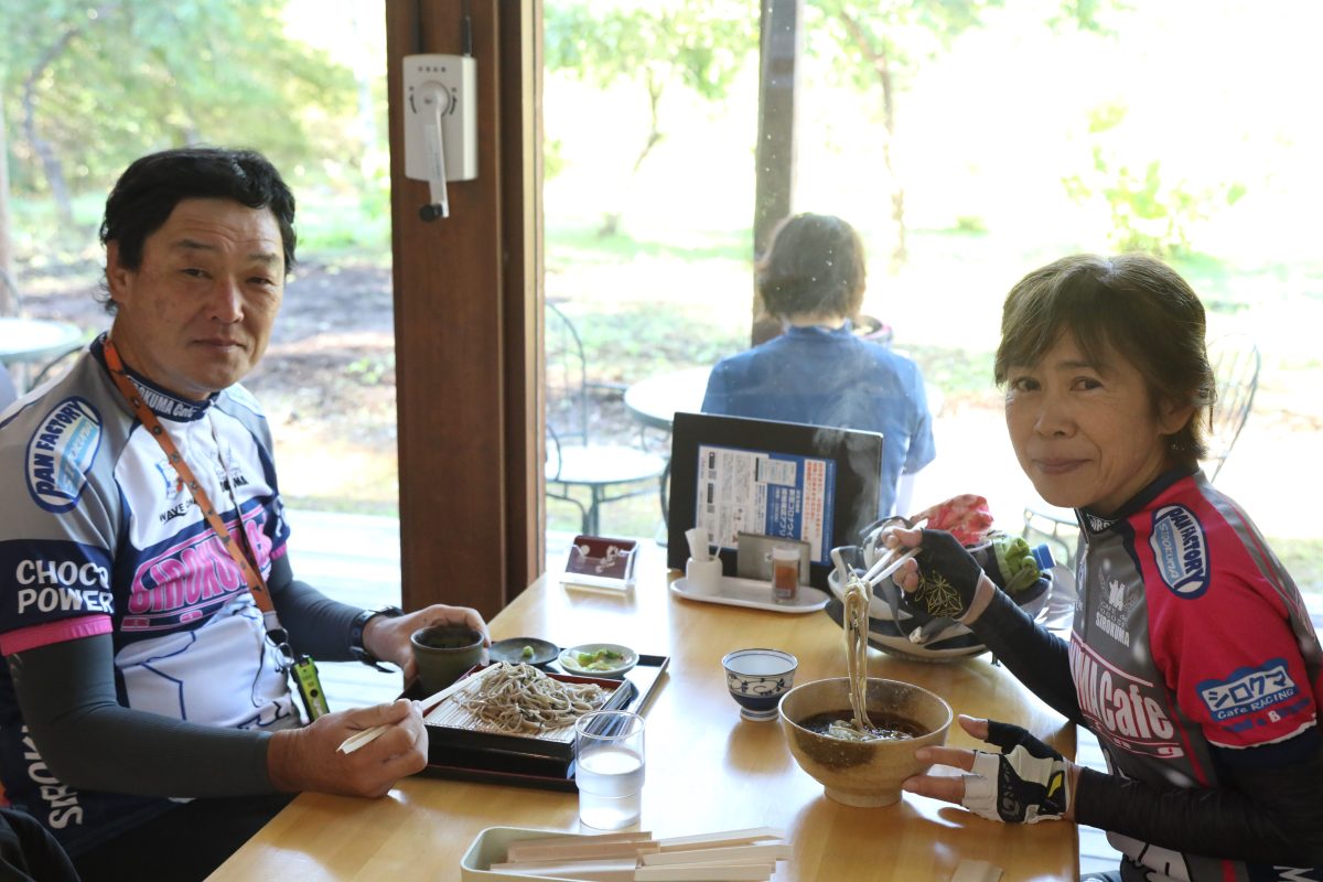 地蔵峠を下ると開田高原へ、彩菜館では早めのランチが待っている。さっきおにぎりを食べたばかりだが峠を上って腹ごなし、温かいそばとざるそばが選べるのもうれしいところ。通常のグランフォンドではありえない、レストランでのぜいたくな食事だ。