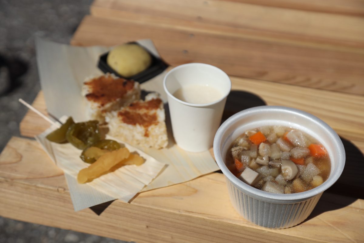 今回最高地点で待っていたのは、地元木曽・御嶽エリアのグルメだ。温かい野菜汁に味噌を乗せた焼きおにぎり、そして甘じょっぱい漬物、そして甘酒だ。