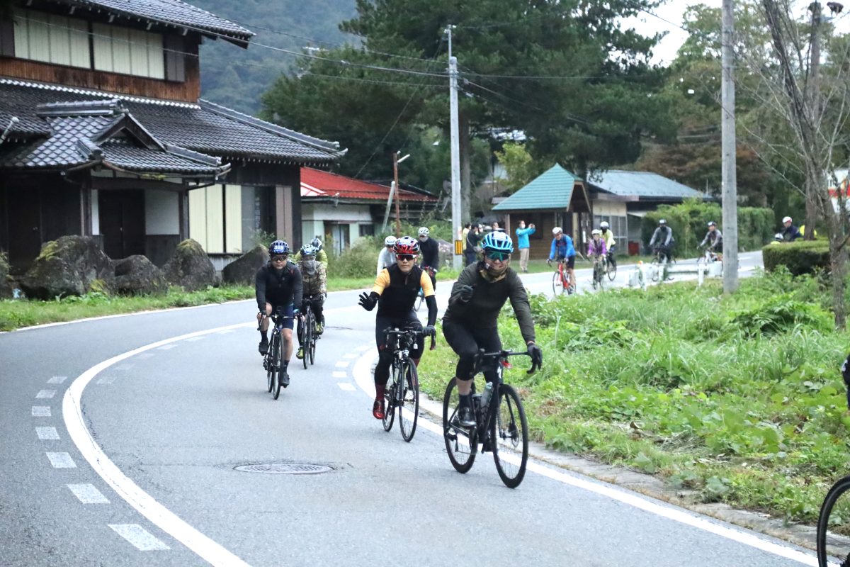 参加者は朝7時、薄曇りのなか御岳湖近くにある日野百草本舗 王滝店から走り始める。はじめは肌寒かったが、しばらくすると日が差し始め、朝日の気持ちがいい風景のなか木曽福島へ向けて下ると旧中山道の町並みを進む。そして20分ほどいくと「中乗りさん」で知られる趣のある建物の中善酒造があり、植物性乳酸あま酒がふるまわれた。