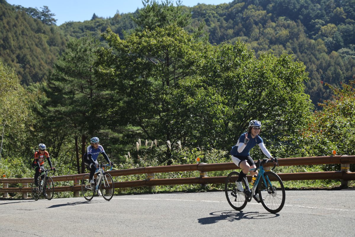 最後は御嶽山を望む気持ちがいい高原や湖の風景を楽しみながらフィニッシュ地点の日野百草本舗 王滝店へ。竹下佳映さんもついつい景色の良さに寄り道をしすぎてしまい最終走者となってしまったが、ライドを満喫した。