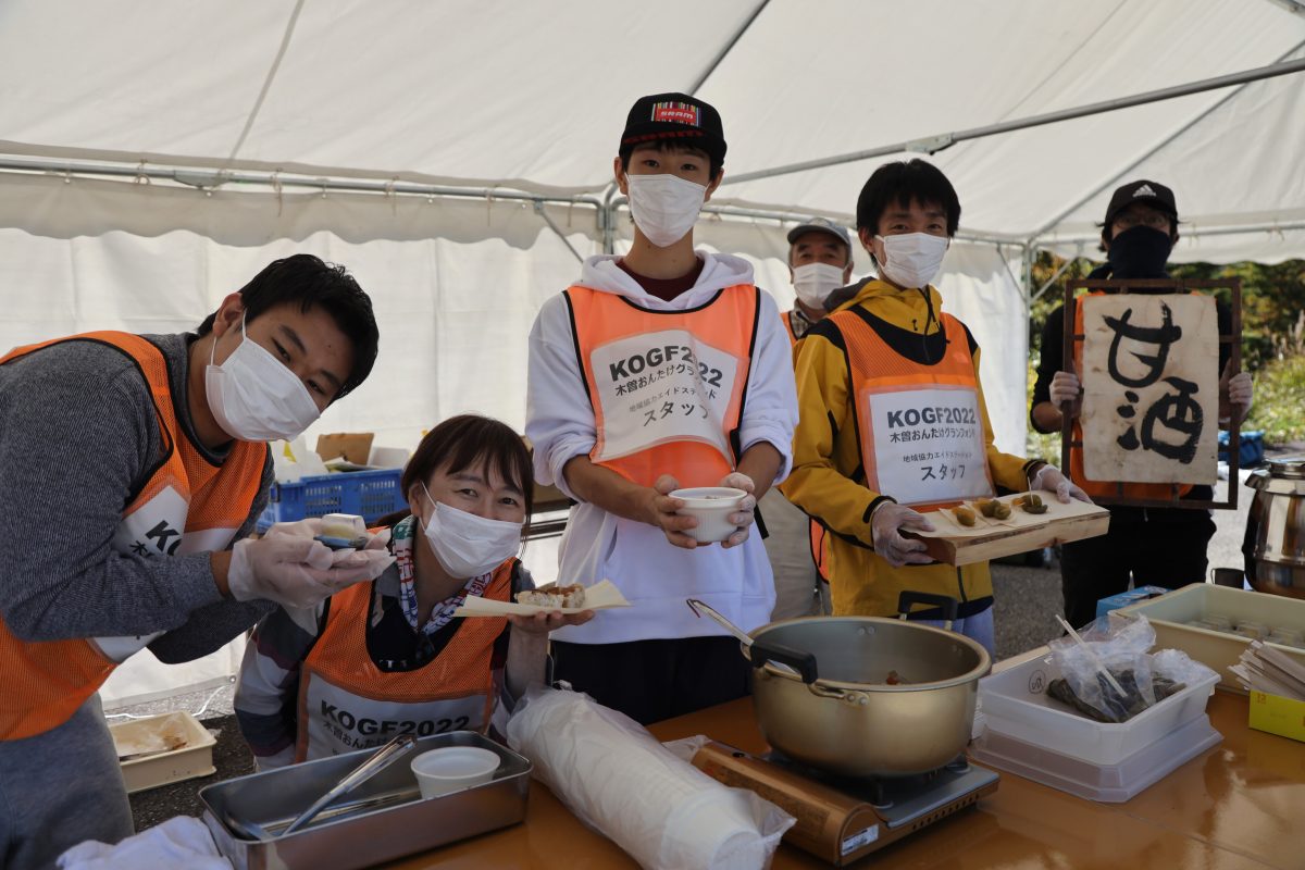 今回最高地点で待っていたのは、地元木曽・御嶽エリアのグルメだ。温かい野菜汁に味噌を乗せた焼きおにぎり、そして甘じょっぱい漬物、そして甘酒だ。