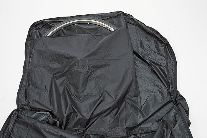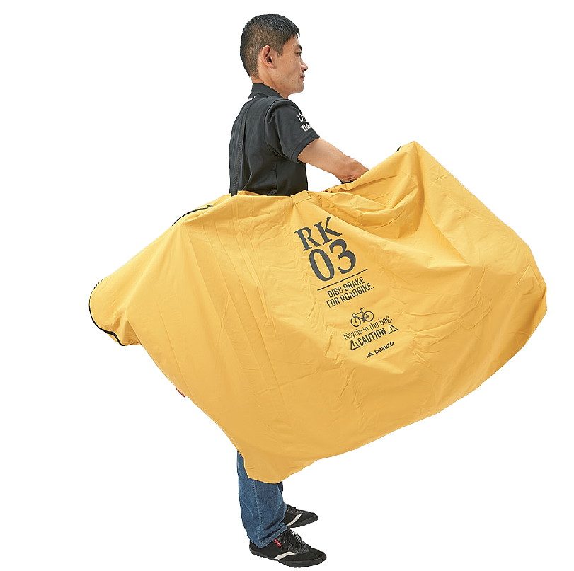ハンドルを90度切らずにディスクブレーキロードを収納できる専用モデル。各種カバーやスペーサー、ベルトなどの付属品がそろっており、そのすべてが使いやすく設計されています。とくにホイール固定のバンドが秀逸。生地自体も非常に丈夫そうです。外袋は大きくサドル下のスペースは、このバッグひとつになります。