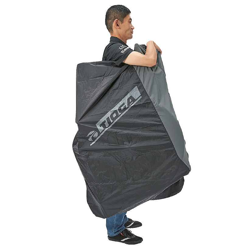 形状としてはスタンダードな縦型輪行袋ながら工夫が効いたモデル。袋を上からかぶせてから90度回転して、その後ファスナーを閉めていきます。グレー生地部分には伸縮性があり、収納のしやすさをサポート。付属の収納ポーチにひと工夫あり、もろもろ付属品を含めても収納しやすい形状になっています。