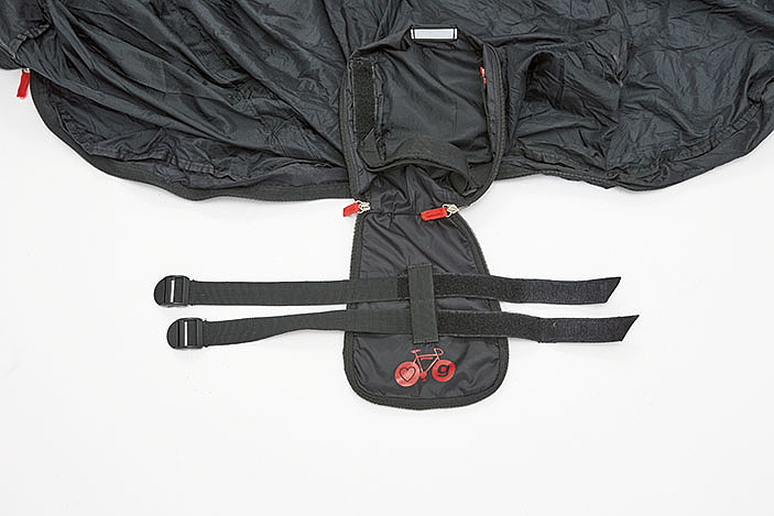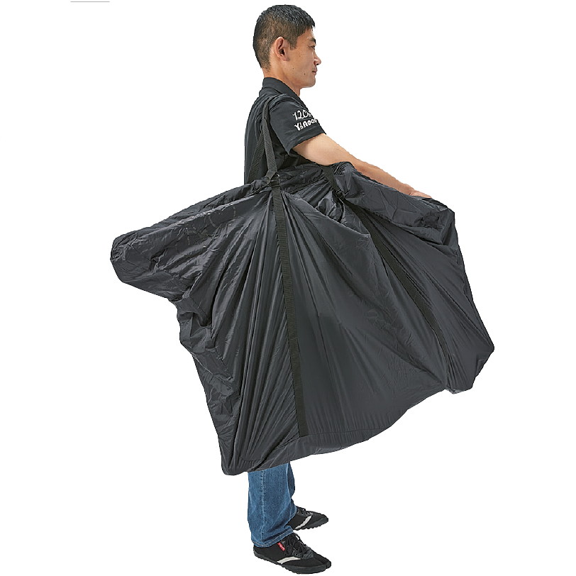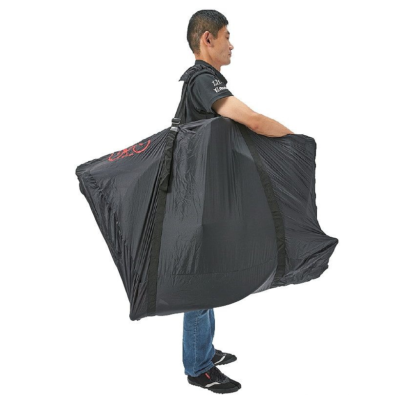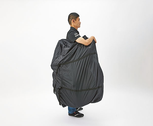 外袋と収納袋が一体化しているモデル。内側で仕切りの布が一体化され、最初は収納に戸惑いましたが、慣れれば作業数が少なくラク。さらにショルダーベルトを車体にくくるのではなく、袋に直接つけているためとにかく時短になります。またそのままだと横型ですが、別売りキットを使えば縦型としても使用できます。