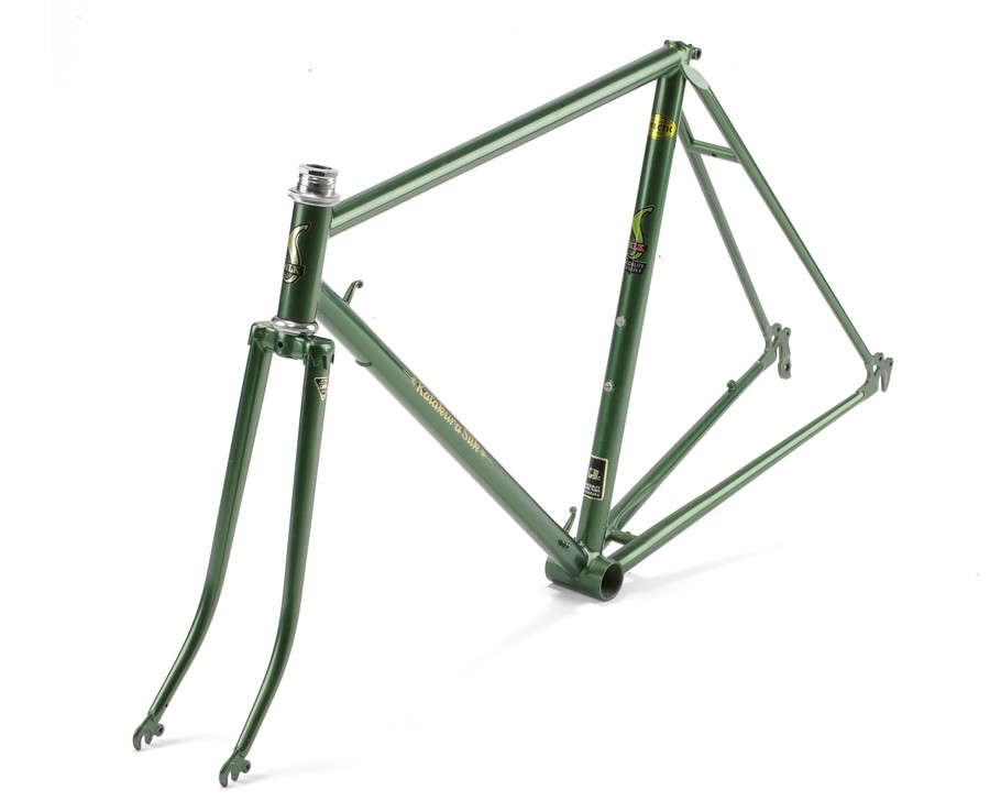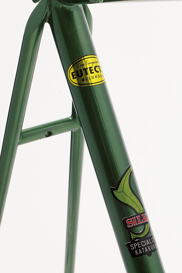 70年代前半の片倉シルク製だ。ランドナーが隆盛だった時代の、どちらかというとロードマン的な位置づけの27インチのフレームだ。ボロサビだったものを塗り替えて再生。廉価なモデルながら日本製らしく作りはていねい。