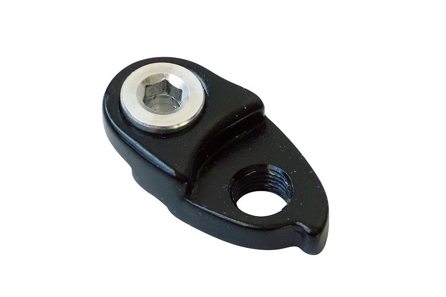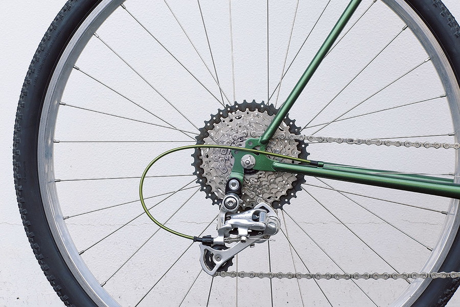 ダートの激坂も行けるリアスプロケット40Tを導入して激軽のギヤ比1以下へ。エンドのリアメカ装着ブラケットへ延長アダプターをかませて、もとは最大スプロケット34T対応のマイクロシフト製、サンエクシードリアメカを40Tでもシフトできるように。