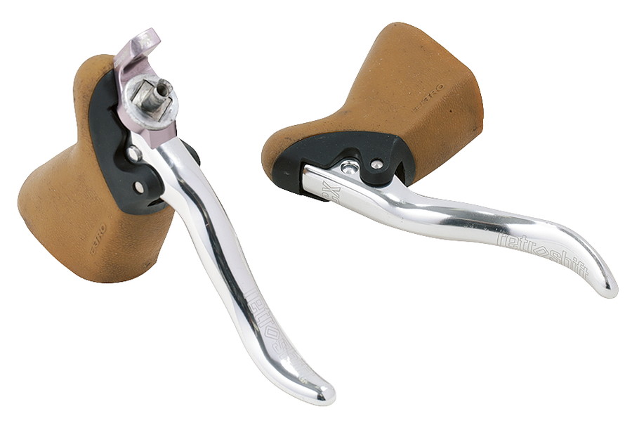 フレアハンドルをいち早く作っていたサルサのウッドチッパーズバーを導入。ラインアップのなかでも元祖で過激な超末広がりフレアだ。ダートでダウンチューブシフターは辛いので手元変速化できるレトロシフトを導入。ダウンチューブ用をこれにつけて手元シフターとする。