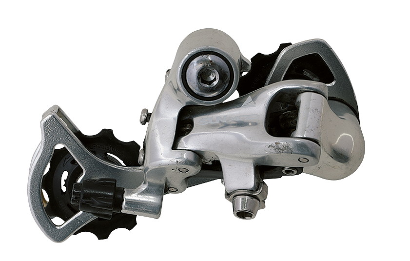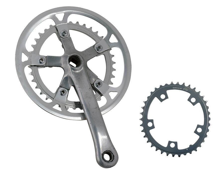 フロントはシングル。黒いシマノ・デオーレLXを剥離してアルミ地化したPCD110クランクに、38Tのインナーリングをインストール。アウターにはチェーン落ちを防げればとチェーンガードを装着した。
