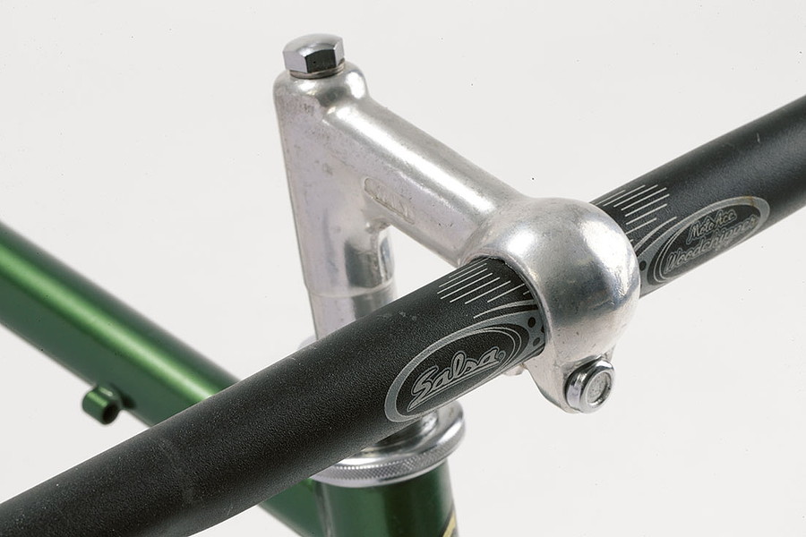 フレアハンドルをいち早く作っていたサルサのウッドチッパーズバーを導入。ラインアップのなかでも元祖で過激な超末広がりフレアだ。ダートでダウンチューブシフターは辛いので手元変速化できるレトロシフトを導入。ダウンチューブ用をこれにつけて手元シフターとする。