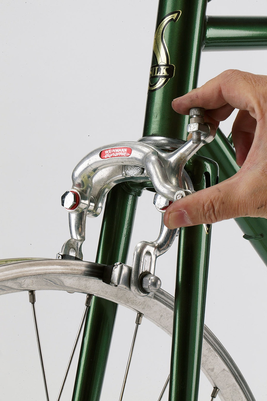 問題はブレーキだ。ラージアーチのブレーキを使ってシューがリム面に当たるようにする。リアはそれでも数㎜足らず小径車のカスタムなどで使われるオフセットしたシューを導入。許せるレベルの制動力を発揮できるように。