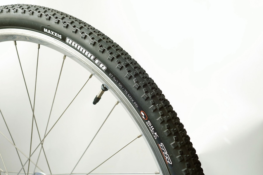 走破性ポイントとなるタイヤまわりは最新に。ベロシティー・A23リムはチューブレスレディ対応。グラベルタイヤの定番、マキシス・ランブラー 27.5×1.50(38C相当)をシーラントを使ってチューブレスで運用。