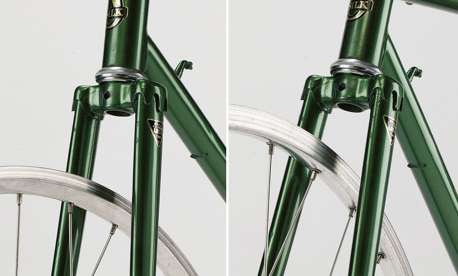 70年代前半の片倉シルク製だ。ランドナーが隆盛だった時代の、どちらかというとロードマン的な位置づけの27インチのフレームだ。ボロサビだったものを塗り替えて再生。廉価なモデルながら日本製らしく作りはていねい。