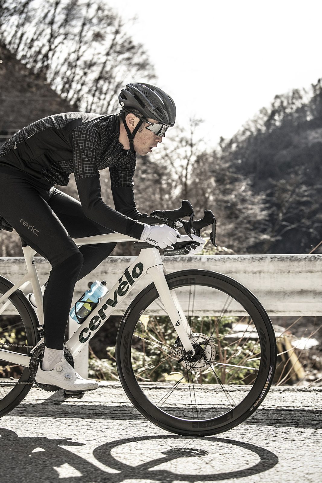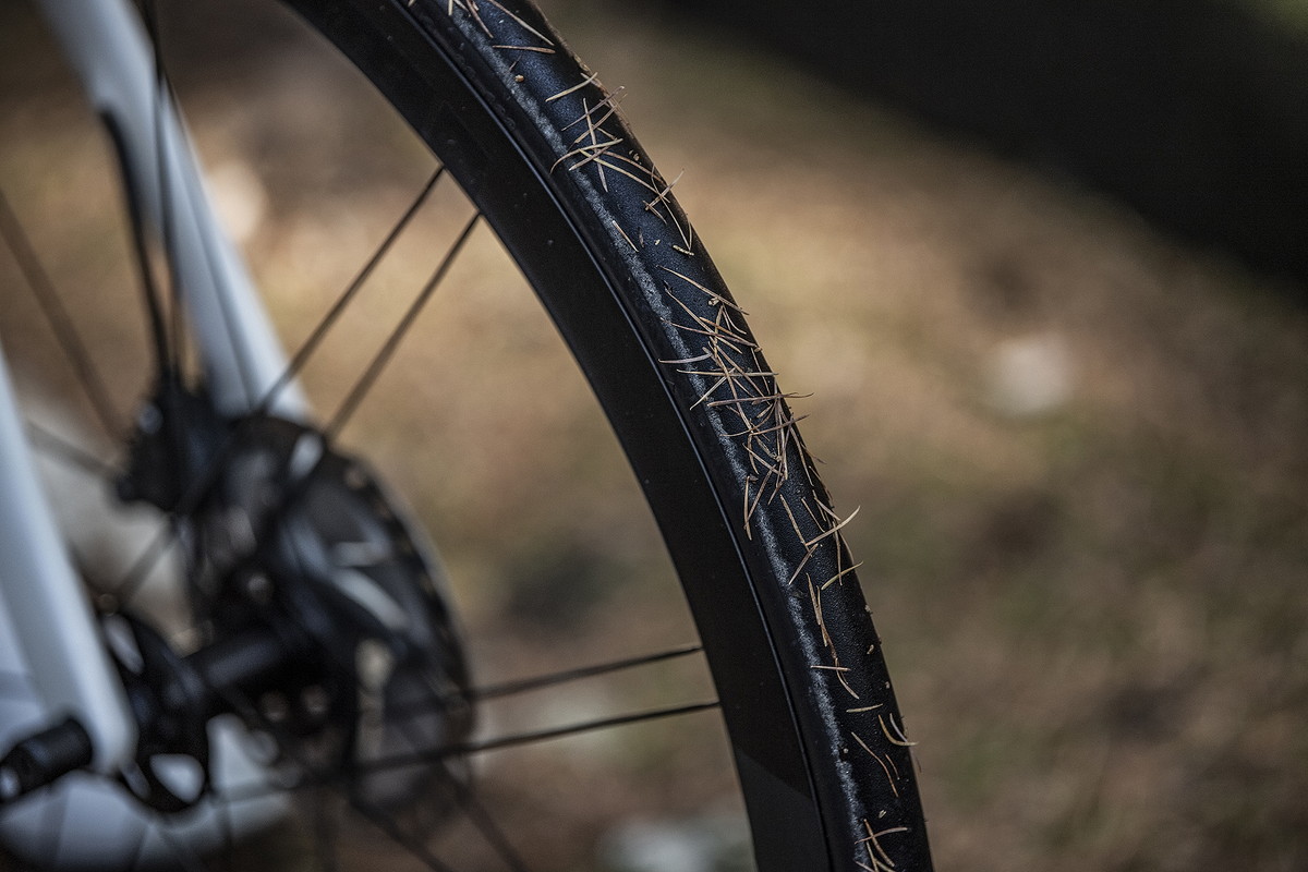 しかしそうした路面を意地悪く走ろうとするより先に、まずそのコンパウンドの粘り感に驚かされた。指先を添わせるとピタリと吸い付く。その印象は、走り出してからのコーナーで正しく体感されるのだった。荒れた路面の下り坂でもしっかりとグリップするその感覚は、28Cという幅の恩恵はあるにしても、信頼が置けるものだ。なお、ライダーの体重は64kgで、空気圧は前後5.3barに設定している。
