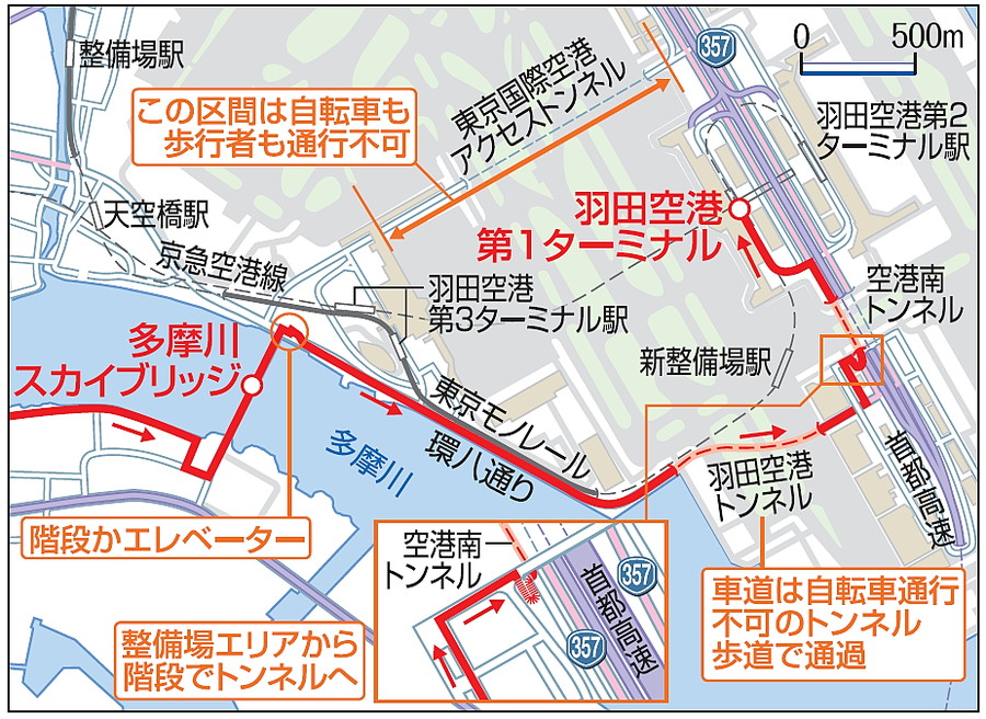 以前、羽田空港へ自転車で行こうと挑戦したんですが通行禁止などがややこしすぎました。一応たどり着いたんですが、正直正しかったのか怪しいなぁ。