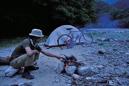 ひとり悦に入っていたが、「ランドナーですか?」と背後から話しかけられギョッとして振り返ると、もう一人キャンプ客がいた。結局この人とたき火を囲んでの2人キャンプとなった。今日はスクーターだが、じつはロードやMTBも持っているサイクリストだという。この木曜日のキャンプ場で、なかなかレアな出会いだと思う。